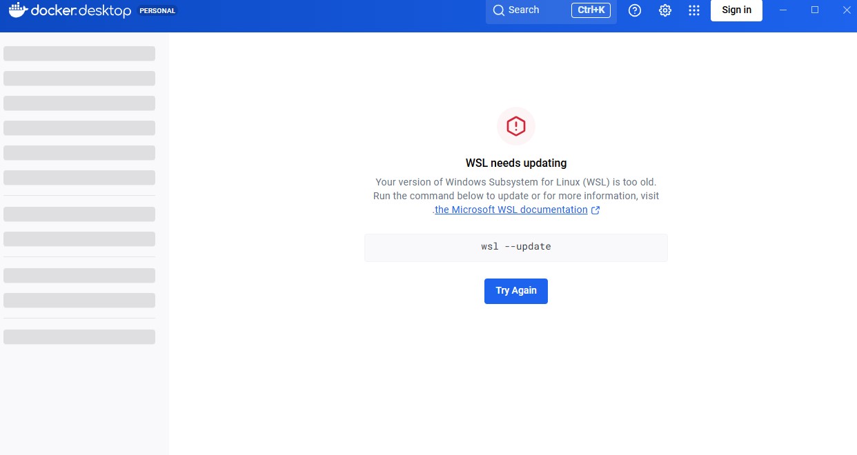 ※もし起動時に 「WSL needs updating」 というエラーが出た場合は、以下の手順でWindowsのWSLを更新してください。
